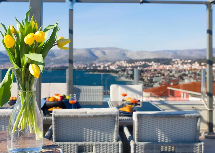A tengerre néző 0 szobás Oceanview Deluxe Penthouse Apartment With 89M2 Living Space 90M2 Roof Terrace Trogir körülbelül 3 km-re található a Szent Domonkos templomtól és kolostortól Trogirban. A vendégek megmártózhatnak a kültéri medencében, hogy egy hosszú nap után kikapcsolódhassanak.